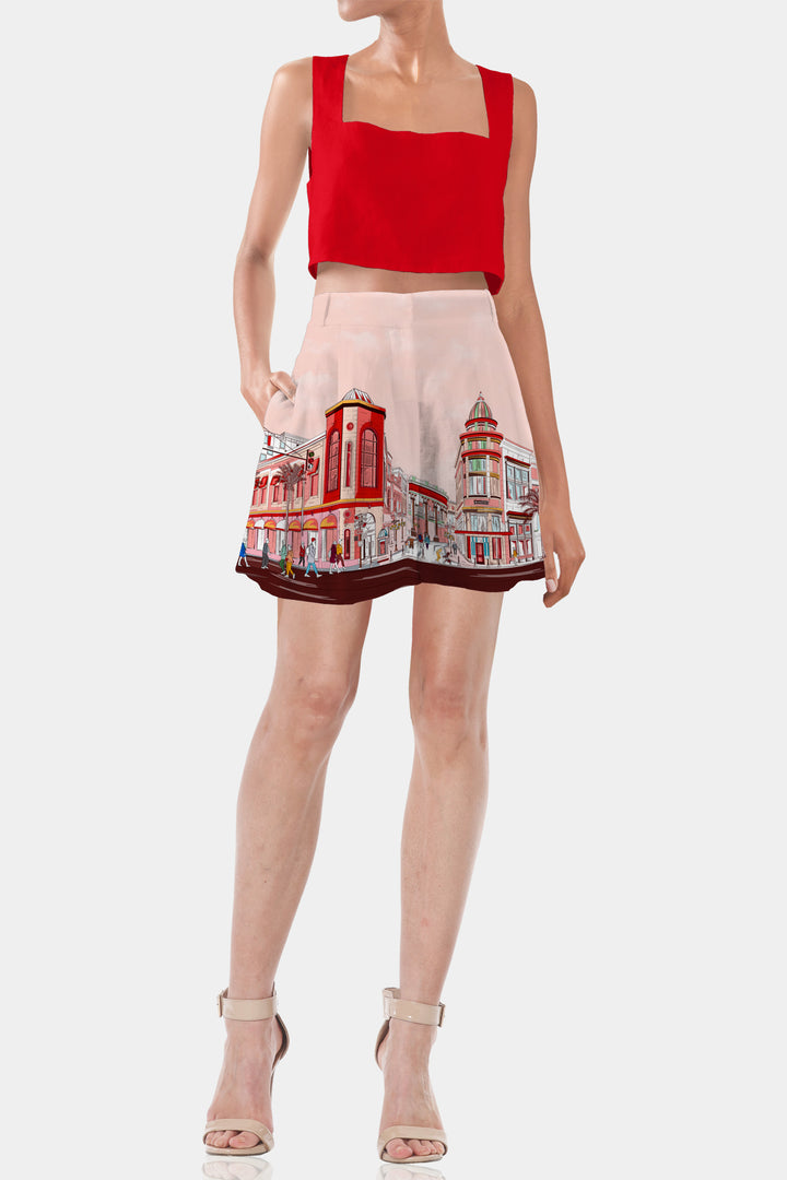 rodeo drive print, bold red wear, stylish bottoms, kyle-x-shahida, trendy shorts, fashion shorts, women’s red shorts