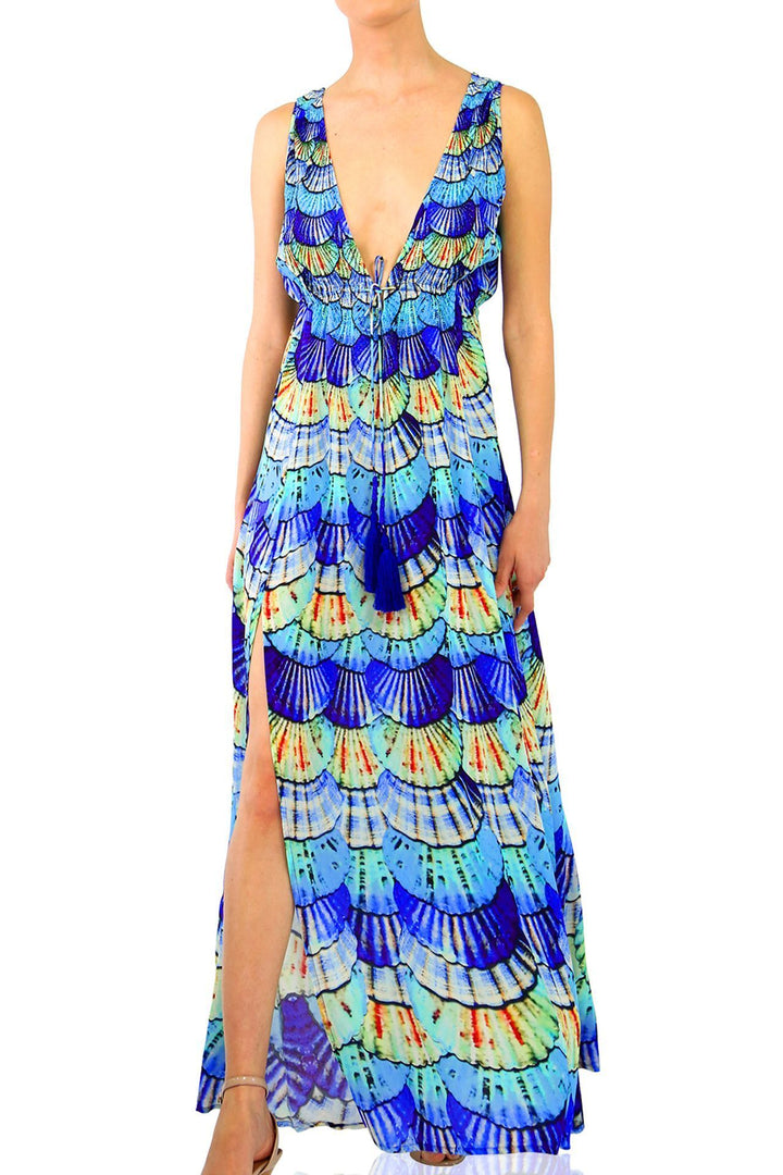 Make a dramatic entrance in a plunging maxi dress featuring a drawstring tie waist and thigh-high slits for boho-chic style.