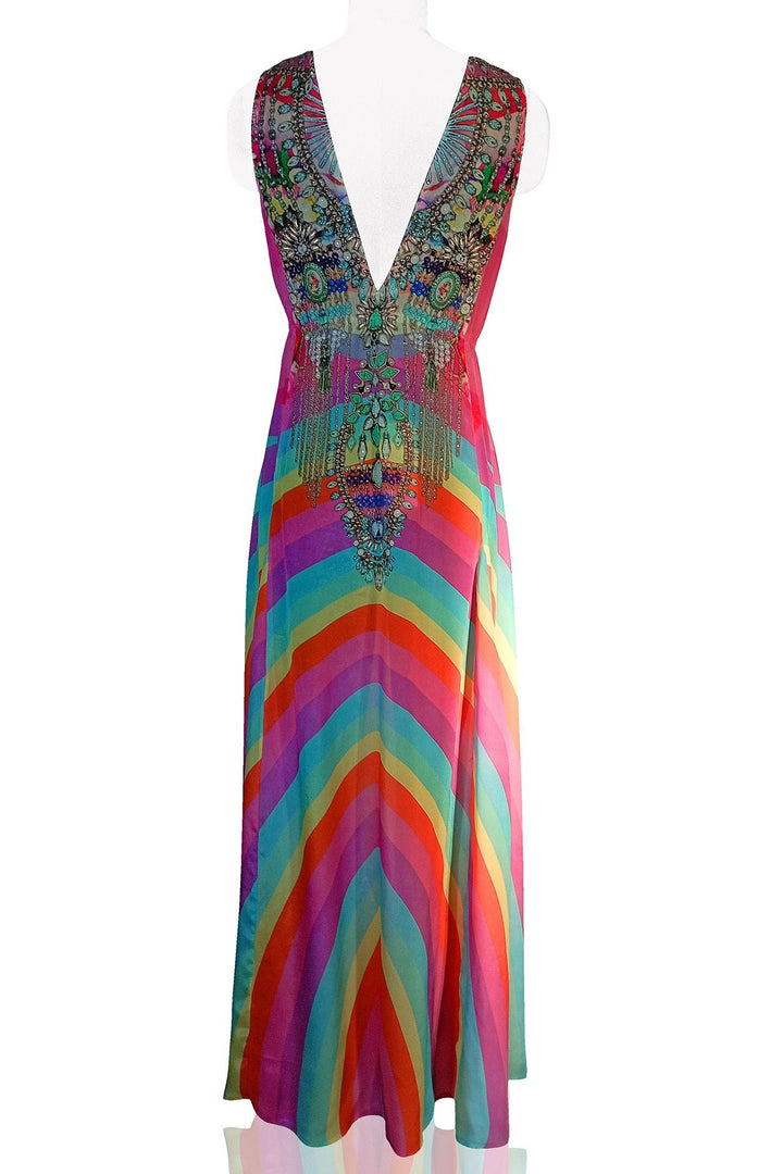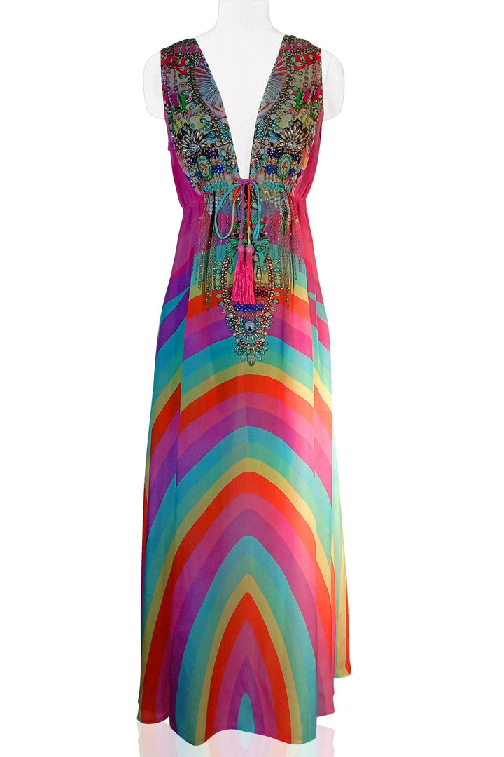 Make a dramatic entrance in a plunging maxi dress featuring a drawstring tie waist and thigh-high slits for boho-chic style.