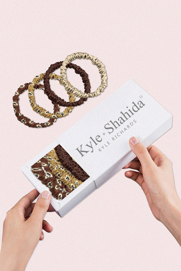 1 Small x Brown Eye Print scrunchies. 1 Small x Yellow Eye Print scrunchies, 1 Small x Yellow scrunchies, 1 Small x Brown scrunchies