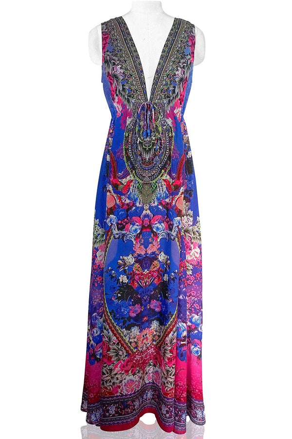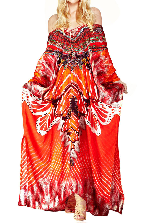 As seen On Kyle Richards Lace Up Caftan Dress In Red Butterfly Print