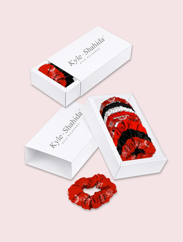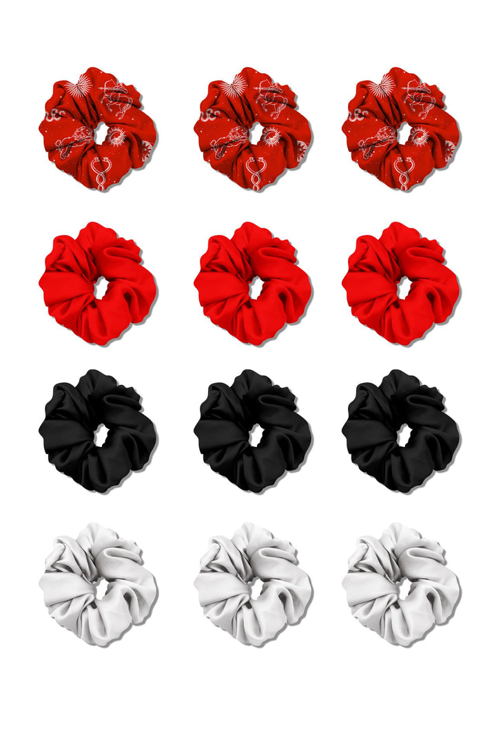3 Large x Red Print scrunchies. 3 Large x Black scrunchies, 3 Large x White scrunchies, 3 Large x Red scrunchies,