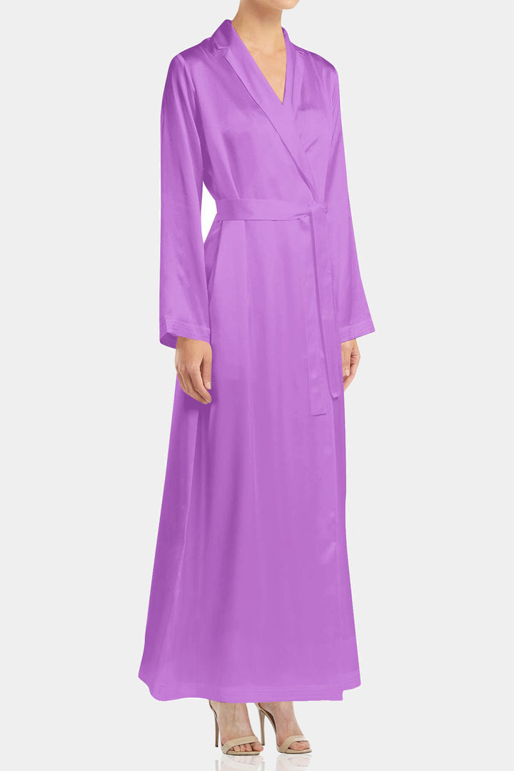 This wrap maxi dresses for women is made of lustrous cupro silk and features an solid African Violet, floor length wrap dress, women's long sleeve wrap dress, at Kyle X Shahida. Wear it loose or cinch the belted waist to define your figure.