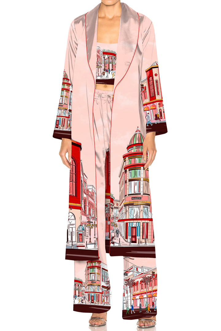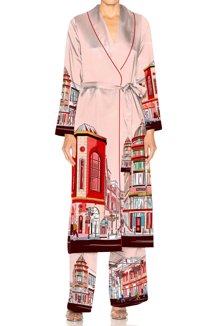 Get ready to elevate your loungewear game with the Rodeo Drive Print Red Robe Silk Kimono by Kyle X Shahida. Made from luxurious silk, this kimono combines comfort and style effortlessly. With its versatile design, it's the perfect addition to your wardrobe. Transform your relaxation time into a luxurious experience with this beautiful kimono.