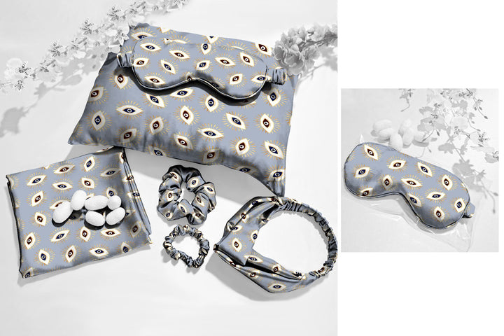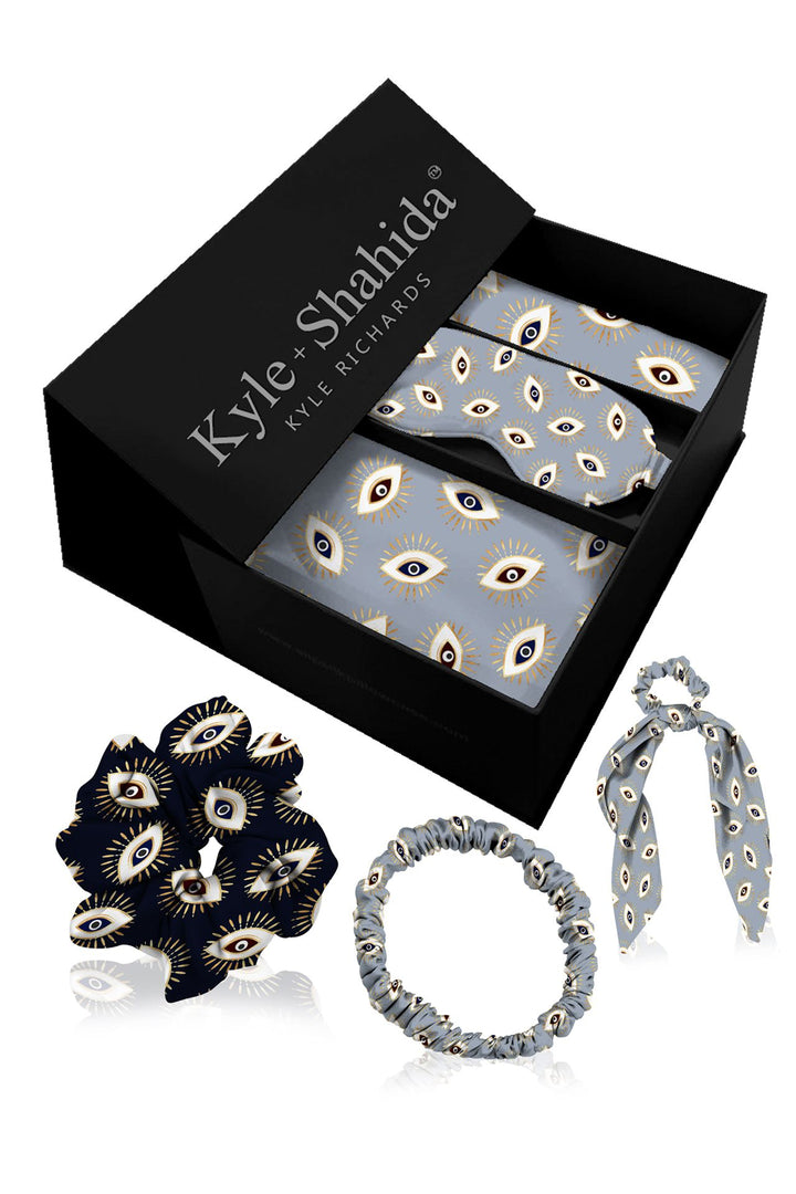 A Gift set of bestseller products. Evil Eye Print Collection Gift Set. This Gift Set includes a  Cami Mini Dress + Face Mask + Eye Mask + Scrunchies all perfectly designed by Kyle and Shahida. Get the best gift for her from our latest collection of gift sets.