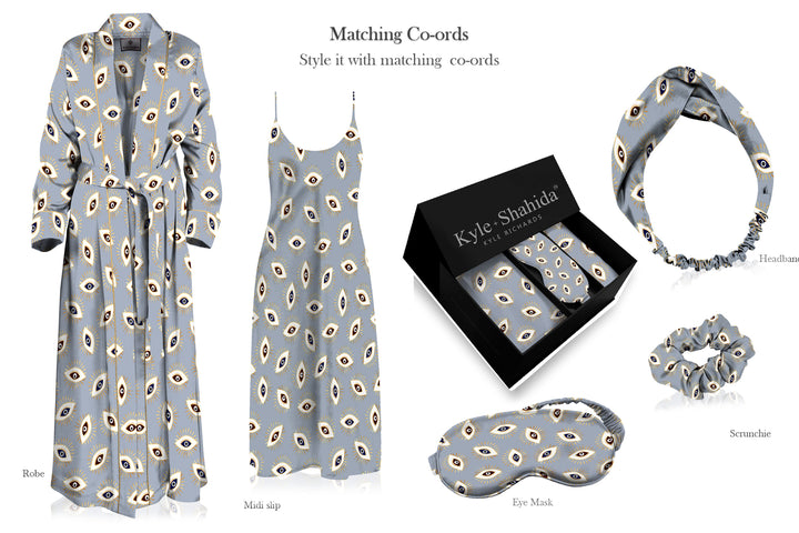 kyle-x-shahida, evil eye robe, grey silk kimono, designer robe, womens luxury wear, protective eye print, long kimono