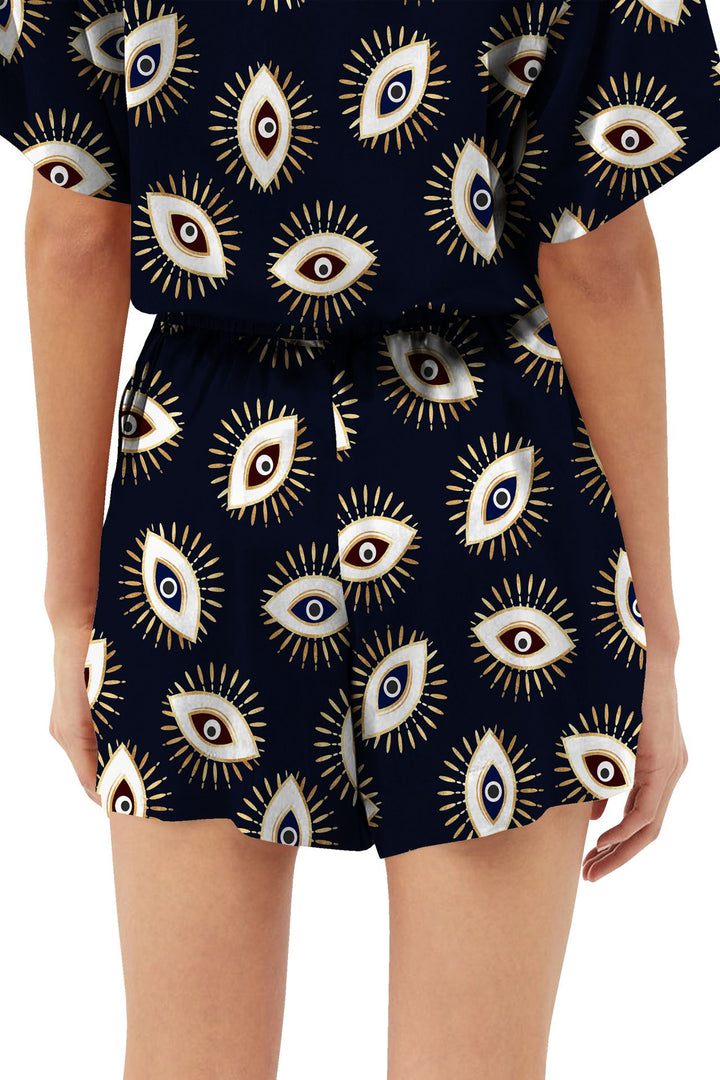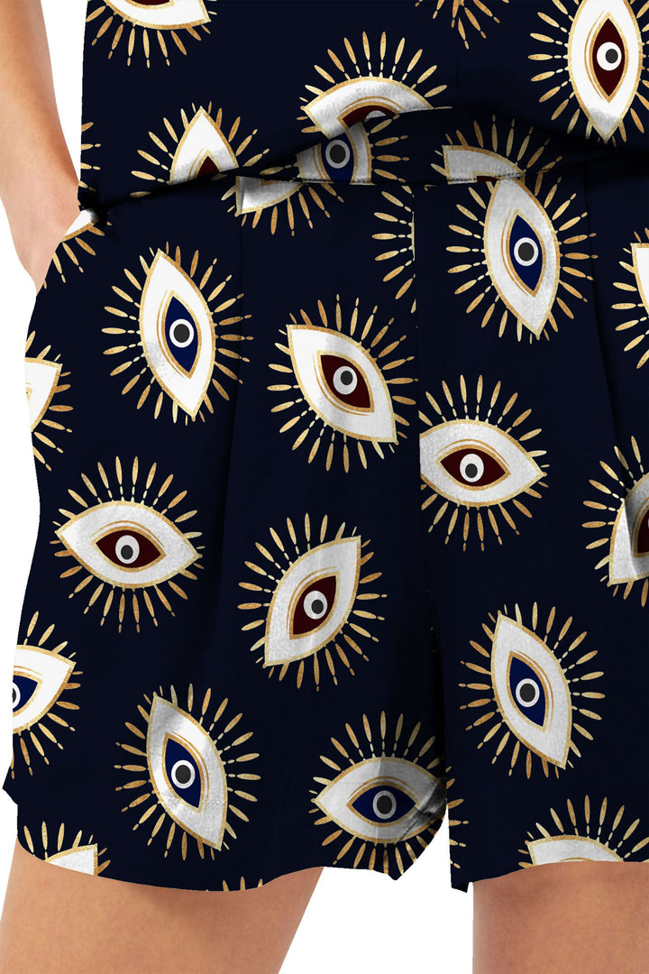Elevate your summer style with these chic and versatile shorts adorned with eye-catching womens printed shorts. This features evil eye shorts with the black color and comfortable fit.